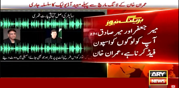 وہ مبینہ آڈیو میں کہتے ہیں ’جو بھی اسمبلی میں ووٹ دینے کے لیے جائے گا اس کے یعنی برینڈڈ ہوفار لائف لیکن جو آج آپ نے برینڈ کرنا ہے نا، میر جعفر اور میر صادق، وہ آپ کو لوگوں کو ’اسپون فیڈ‘ کرنا ہے۔‘‘
