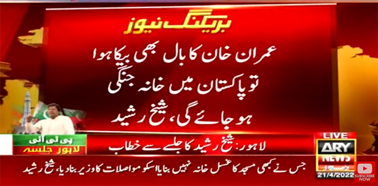 سابق وزیر داخلہ شیخ رشید نے کہا ہے کہ خون کی لڑائی جاری ہے خون کے آخری قطرےتک عمران خان کیساتھ ہوں عمران خان کا بال بھی بیکا ہوا تو پاکستان میں خانہ جنگی ہو جائےگی۔