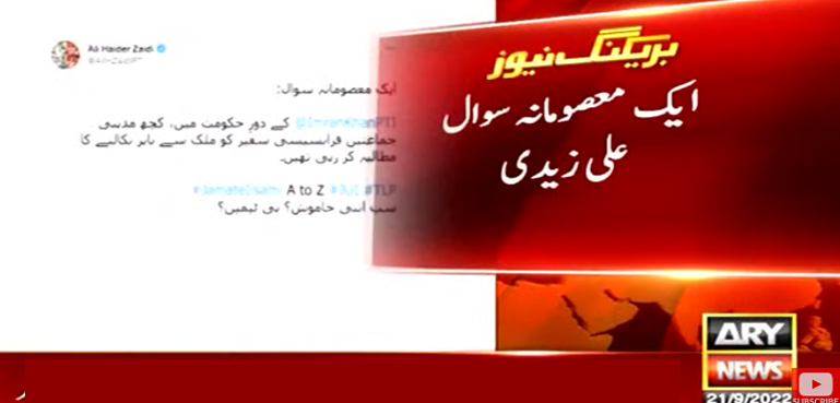 علی زیدی نے اپنی ٹوئٹ میں کہا ہے کہ عمران خان کے دور حکومت میں کچھ جماعتیں فرانسیسی سفیر کو باہر نکالنے کا مطالبہ کر رہی تھیں۔