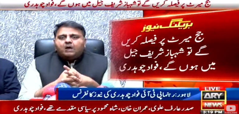 پی ٹی آئی رہنما فواد چوہدری نے کہا ہے کہ وزیراعظم شہباز شریف اس وقت عبوری ضمانت پر ہیں، جج میرٹ پر فیصلہ کریں تو شہبازشریف جیل میں ہوں گے۔