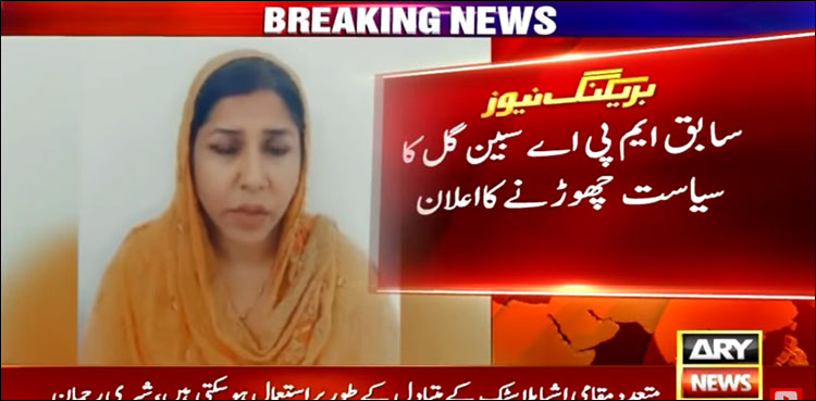 تفصیلات کے مطابق سابق ایم پی اے سبین گل نے پریس کانفرنس میں سیاست چھوڑنے کا اعلان کر دیا، انھوں نے کہا میں نے ہمیشہ پرامن سیاست کی ہے، کبھی جلاؤ گھیراؤ کا حصہ نہیں رہی، 9 مئی کو ہونے والے جلاؤ گھیراؤ کی مذمت کرتی ہوں۔