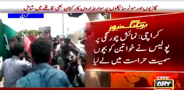 کراچی: پولیس نے اسلام آباد لاہور کے بعد کراچی میں بھی ایکشن لیتے ہوئے حقیقی آزادی لانگ مارچ کیلئے نمائش چورنگی پر احتجاج میں شامل خواتین کو بچوں سمیت گرفتار کرلیا۔