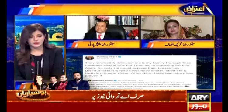 اے آر وائی نیوز کے پروگرام ’اعتراض ہے‘ میں گفتگو کرتے ہوئے پی ٹی آئی رہنما ملیکہ بخاری نے کہا کہ عمران خان کو تکنیکی طریقے سے نااہل کروانے کی کوشش کی جارہی ہے، فسطائیت کا دور ہے عمران خان پر دہشت گردی کے مقدمے بنائے جارہے ہیں۔