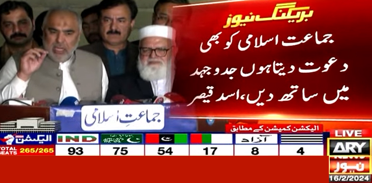 نائب امیر جماعت اسلامی لیاقت بلوچ نے کہا کہ دھاندلی کی وجہ سے ہم نے الیکشن کو پہلے ہی مسترد کر دیا تھا چیف الیکشن کمشنر کے استعفے سپریم کورٹ کی سطح پر تحقیقات کا مطالبہ کیا تھا، ملک کے وسیع تر مفاد میں ہم نے سب کیساتھ بیٹھنےکا فیصلہ کیا تھا جمہوری قوتوں کی ذمہ داری ہےکہ شفاف الیکشن درست راستہ ہے۔