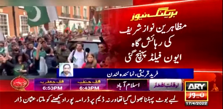 پی ٹی آئی حکومت کے خاتمے کے خلاف لندن میں پی ٹی آئی کارکنان نے ایون فیلڈ کے سامنے احتجاج کیا اور سابق وزیراعظم نواز شریف کی رہائش گاہ کے سامنے مارچ کیا۔ اس موقع پر پی ٹی آئی کارکنان نے ’امپورٹڈ گورنمنٹ نامنظور’ کے نعرے لگائے۔