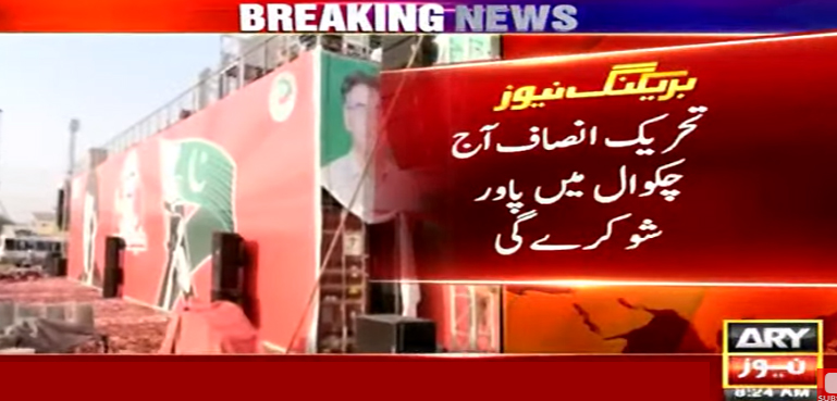 اے آر وائی نیوز کے مطابق پی ٹی آئی کے آج چکوال میں جلسہ عام کے لیے اسلامیہ گراؤنڈ میں 80 فٹ چوڑا اور 20 فٹ اونچا اسٹیج تیار کیا گیا ہے جب کہ جلسہ گاہ میں خواتین اور بچوں کے لئے علیحدہ اینکلیو بنایا گیا ہے۔