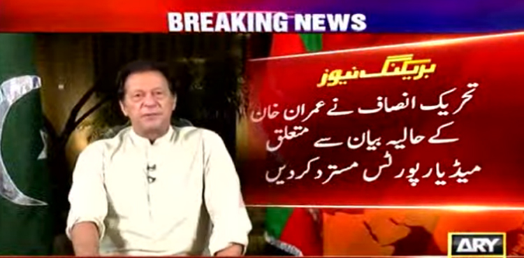 تفصیلات کے مطابق تحریک انصاف نے عمران خان کے حالیہ بیان سے متعلق میڈیا رپورٹس مسترد کر دیں اور بیان میں کہا کہ عمران خان نے کبھی یہ نہیں کہا کہ امریکی سازش نہیں تھی۔