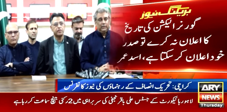 سیکریٹری جنرل پی ٹی آئی اسد عمر نے کراچی میں علی زیدی کے ہمراہ پریس کانفرنس کرتے ہوئے کہا کہ صدر مملکت عارف علوی کا آج تک کا کردار آئینی رہا ہے، ان سے درخواست ہے کہ ملک کو آئینی بحران سے نکالیں اور اپنا آئینی کردار ادا کریں، پاکستان کے آئین، جمہوریت اور سالمیت کا دفاع کیا جائے، قوم صدر پاکستان کی طرف دیکھ رہی ہے۔