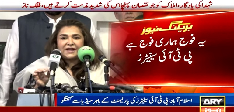 سینیٹر فلک ناز نے کہا کہ 9 مئی کے واقعات کے پی ٹی آئی اور سینیٹرز کی جانب سے جتنی مذمت کروں کم ہے۔ پی ٹی آئی کا منشور ہے پاکستان ہے تو ہم ہیں، سب سے پہلے پاکستان اور پاک فوج ہے پارٹی بعد میں ہے، شہدا کی یادگار اور املاک کو جو نقصان پہنچا اس کی شدیدمذمت کرتے ہیں۔