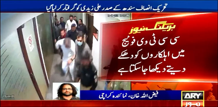 پی ٹی آئی سندھ کے صدرعلی زیدی کو ڈیفنس کے دفتر سے گرفتار کر لیا گیا، ان کی گرفتاری ابراہیم حیدری تھانے میں درج فراڈ کے مقدمے میں کی گئی ہے۔