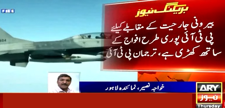 پاکستان تحریک انصاف کے ترجمان نے کہا ہے کہ بیرونی جارحیت سے مقابلے کے لیے پی ٹی آئی پوری طرح پاک افواج کے ساتھ کھڑی ہے۔