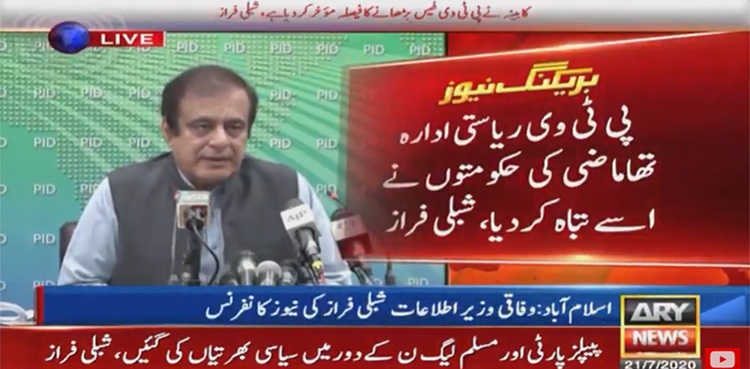 شبلی فراز نے بتایا کہ پی ٹی وی فیس بڑھانےکامعاملہ آئندہ ہفتےتک مؤخر کیا گیا ہے جب کہ ٹی وی چینلز اور اخبارات کےبقایات آئندہ ہفتےتک اداکردیئےجائیں گے۔