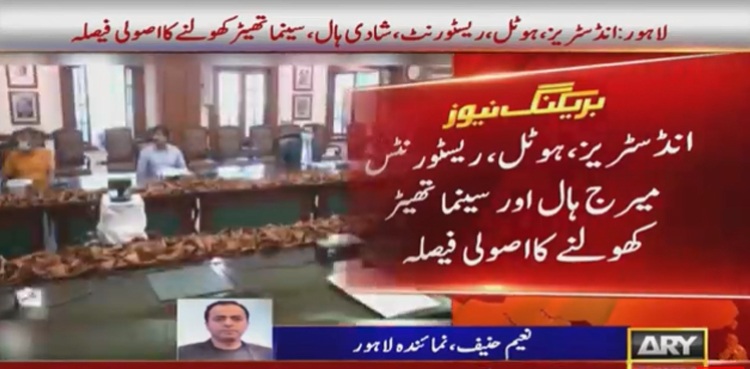 تفصیلات کے مطابق وزیراعلیٰ پنجاب کی ہدایت پر کابینہ کمیٹی برائے کرونا کنٹرول کا خصوصی اجلاس ہوا جس میں انڈسٹریز، ہوٹل، ریسٹورنٹس، میرج ہال اور سینما تھیٹر کھولنے کا اصولی فیصلہ کیا گیا۔