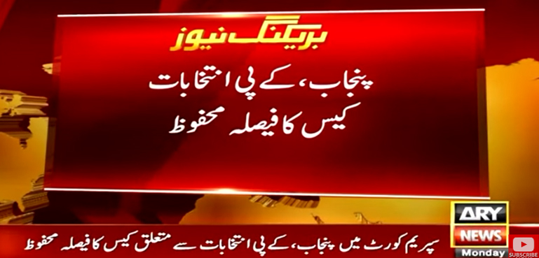 اے آر وائی نیوز کے مطابق پنجاب اور خیبر پختونخوا میں انتخابات کے التوا کے خلاف پاکستان تحریک انصاف کی جانب سے دائر درخواست سپریم کورٹ کے تین رکنی بینچ نے کئی روز سماعت کے بعد آج فیصلہ محفوظ کر لیا ہے جو کل سنایا جائے گا۔