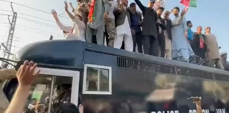 پولیس نے پی ٹی آئی کے کارکنوں کو قیدیوں کی گاڑی میں بیٹھنے کی آفر دے دی۔ پولیس کا کہنا ہے کہ جو گرفتاریاں دینا چاہتے ہیں وہ گاڑیوں میں بیٹھ سکتے ہیں، قیدیوں کی گاڑیاں موجود ہیں جس نے بھی گرفتاری دینی ہے وہ دے دے۔