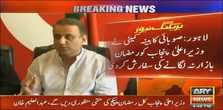 اے آر وائی نیوز کی رپورٹ کے مطابق سینئر وزیرپنجاب عبدالعلیم خان کی زیرصدارت رمضان پیکج کے حوالے سے کابینہ کمیٹی کا اجلاس ہوا جس میں کمیٹی نے وزیراعلیٰ پنجاب کو رمضان بازار نہ لگانے کی سفارش کی۔