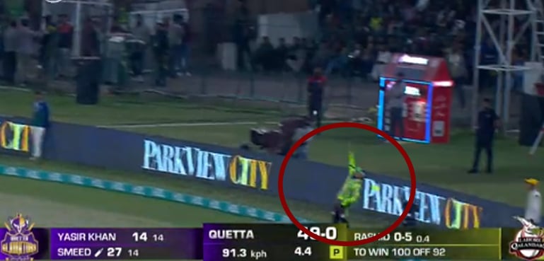 149 رنز کے ہدف کے تعاقب میں کوئٹہ گلیڈیئٹرز کے اوپنرز نے شاندار آغاز کیا اور 5 اوورز پورے ہونے سے قبل ہی ٹیم کی نصف سنچری ہوگئی تھی۔ انگلینڈ سے تعلق رکھنے والے ول اسمیڈ اسکور بورڈ میں تیزی سے اضافہ کر رہے تھے اور اسی کوشش میں انہوں نے راشد خان کی گیند پر زور دار شاٹ کھیلا۔