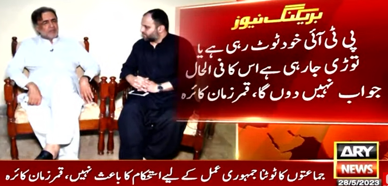 پاکستان پیپلز پارٹی کے رہنما قمر زمان کائرہ نے کہا ہے کہ پی ٹی آئی خود ٹوٹ رہی ہے یا توڑی جا رہی ہے اس کا فی الحال جواب نہیں دوں گا۔