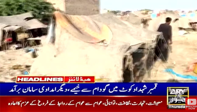 تفصیلات کے مطابق صوبہ سندھ کے ضلع قمبر شہدادکوٹ میں ڈسٹرکٹ اینڈ سیشن جج نے رائس مل کے گودام پر چھاپہ مارا، اس دوران بڑی تعداد میں سیلاب متاثرین کے خیمے اور دیگر امدادی سامان برآمد کیا گیا۔