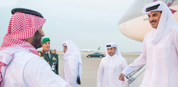 امیر قطر شیخ تمیم بن حمد آل ثانی ریاض پہنچے تو سعودی ولی عہد شہزادہ محمد بن سلمان نے طیارے کے قریب پہنچ کر خوش آمدید کہا۔