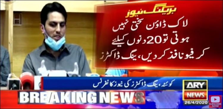 کوئٹہ: بلوچستان کے ینگ ڈاکٹرز نے حکومت سے مطالبہ کیا ہے کہ کرونا وائرس کی روک تھام کے لیے اسمارٹ لاک ڈاؤن نہیں بلکہ بیس روز تک سخت کرفیو نافذ کیا جائے۔