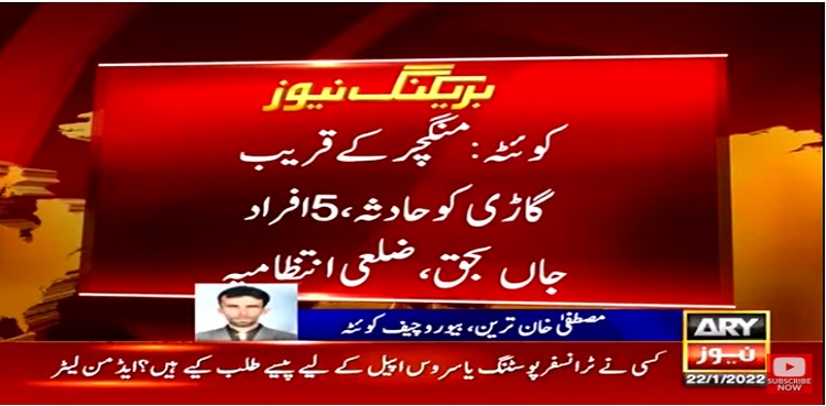 ضلعی انتظامیہ کی جانب سے جاری بیان کے مطابق کوئٹہ کے علاقے منگچر میں کار اور مسافر کوچ کے درمیان دلخراش حادثہ پیش آیا، حادثے کے نتیجے میں پانچ افراد جاں بحق ہوگئے ہیں۔
