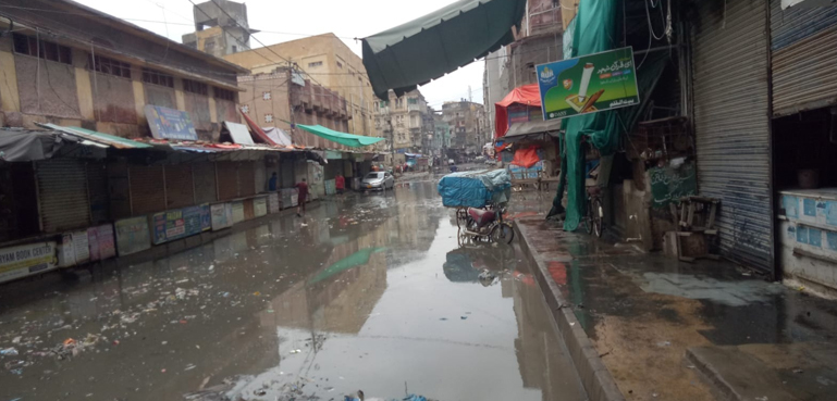 کراچی میں مون سون کی بارشوں کا سلسلہ جاری ہے اور شہر کے سب سے بڑے اردو بازار کی دکانوں میں برساتی اور سیوریج کا پانی داخل ہوگیا ہے۔
