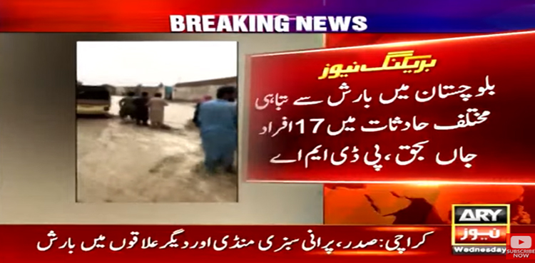 پی ڈی ایم اے کے مطابق کوئٹہ سمیت بلوچستان کے مختلف علاقوں میں دو روز سے جاری بارش نے تباہی مچادی ہے جس سے کوئٹہ، خضدار اور آواران زیادہ متاثر ہوئے ہیں، بارشوں کے سبب دیواریں گرنے، کرنٹ لگنے اور سیلابی ریلے میں بہہ جانے سے مختلف واقعات و حادثات میں اب تک سترہ افراد جاں بحق ہوچکے۔