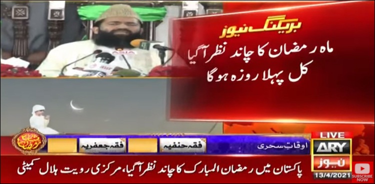 رویت ہلال کمیٹی کے چیئرمین نے اجلاس کے بعد میڈیا سے گفتگو کرتے ہوئے بتایاکہ پاکستان کے مختلف علاقوں میں مطلع بالکل صاف تھا، کئی شہروں سے چاند کی شہادتیں موصول ہوئیں، جس کے بعد متفقہ فیصلہ کیا گیا کہ کل یعنی 14 اپریل بروز بدھ کا پاکستان میں پہلا روزہ ہوگا۔
