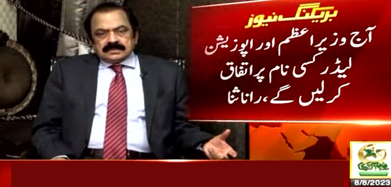 وفاقی وزیر داخلہ رانا ثنا اللہ نے کہا ہے کہ وزیراعظم شہباز شریف اور اپوزیشن لیڈر راجا ریاض آج نگراں وزیراعظم کے لیے کسی نام پر اتفاق کر لیں گے۔