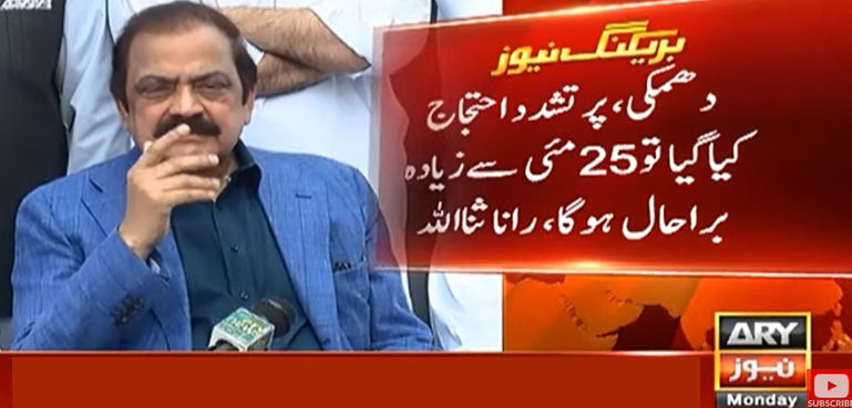 اے آر وائی نیوز کے مطابق وفاقی وزیر داخلہ رانا ثنا اللہ نے فیصل آباد بریگیڈیئر خالد شہید کے اہلخانہ سے تعزیت کے بعد میڈیا سے گفتگو کرتے ہوئے کہا کہ یہ کہتے ہیں 13 اگست کو جلسہ کرینگے پھر ایک ماہ کا الٹی میٹم دینگے، دو نمبر الٹی میٹم کوئی تسلیم نہیں کریگا، پُرامن جلسے اور احتجاج آپ کا آئینی حق ہے لیکن اگر دھمکی اور پرتشدد احتجاج کیا تو 25 مئی سے زیادہ برا حال ہوگا۔