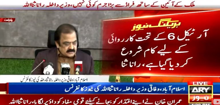 اے آر وائی نیوز کے مطابق وفاقی وزیر داخلہ رانا ثنا اللہ نے اسلام آباد میں پریس کانفرنس کرتے ہوئے کہا ہے کہ سپریم کورٹ کے فیصلےسے آئین کی سر بلندی ہوئی ہے، آئین پاکستان عوام کی مقدس امانت ہے اور یہ ساری چیزیں سپریم کورٹ کے تفصیلی فیصلے میں بیان کی گئی ہیں، ملک کے آئین کیساتھ فراڈ سے بڑا کوئی اور جرم نہیں اور اس کی سزا آرٹیکل 5 اور 6 میں درج ہے، جس کے بعد آرٹیکل 6 کے تحت کارروائی کیلیے کام شروع کردیا گیا ہے۔