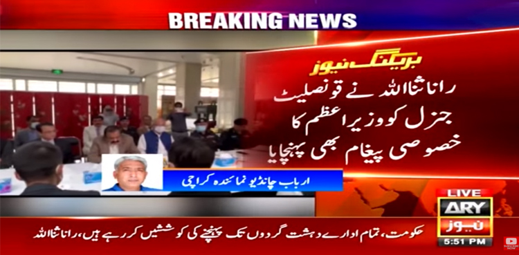 اے آر وائی نیوز کے مطابق وزیر داخہ رانا ثنا اللہ نے چین قونصل جنرل کو وزیر اعظم شہباز شریف کا خصوصی پیغام پہنچایا۔ ملاقات میں وزیر اعلیٰ سندھ مراد علی شاہ، آئی جی پولیس مشتاق مہر، مرتضیٰ وہاب، ایڈیشنل آئی جی و دیگر افسران بھی موجود تھے۔