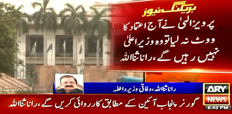 رانا ثنا اللہ نے بتایا: ’وزیر اعلیٰ نے اعتماد کا ووٹ نہ لیا تو گورنر انہیں ڈی نوٹیفائی کر سکتے ہیں۔ گورنر ان کو ہٹانے کا نوٹی فکیشن جاری کریں گے جس میں کہا جائے گا کہ وزیر اعلیٰ پر ہاؤس کا اعتماد نہیں رہا۔ اس صورتِ حال میں اگر وزیر اعظم کارروائی کرنا چاہیں تو وہ بھی کر سکتے ہیں۔‘
