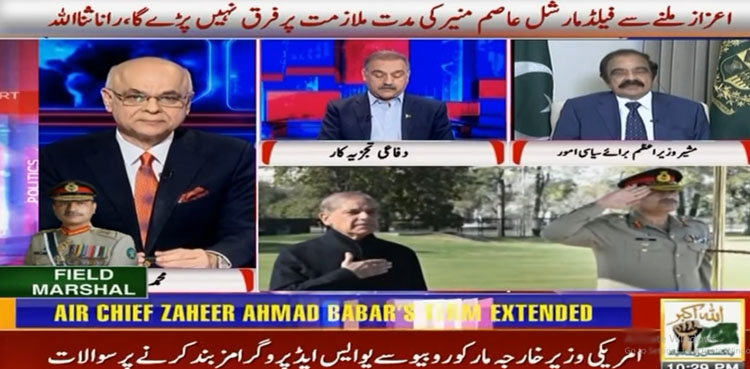 رانا ثنا نے کہا کہ اعزاز ملنے سے فیلڈ مارشل عاصم منیرکی ملازمت کو کوئی فرق نہیں پڑےگا، فیلڈ مارشل کا اعزاز جنرل عاصم منیر کےساتھ ہمیشہ رہےگا، حکومت فیلڈ مارشل کا اعزاز دے سکتی ہے،