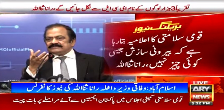 پریس کانفرنس کرتے ہوئے وزیر داخلہ رانا ثنا اللہ نے کہا کہ قومی سلامتی کمیٹی کا اعلامیہ بتا رہا ہے کہ بیرونی سازش جیسی کوئی چیز نہیں۔