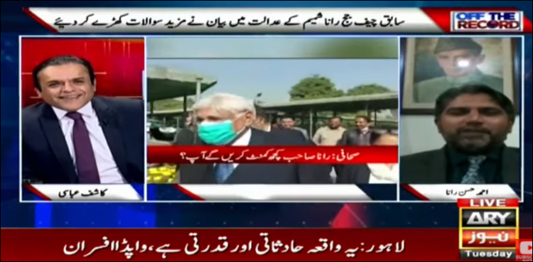اے آر وائی نیوز کے پروگرام آف دی ریکارڈ میں میزبان کاشف عباسی سے گفتگو کرتے ہوئے رانا شمیم کے صاحبزادے احمد حسن رانا نے کہا کہ رانا شمیم کا بیان حلفی میں نے بھی دیکھا، نوٹرائزر ہوتے وقت کسی نے تصویر لے کر اسے لیک کیا۔