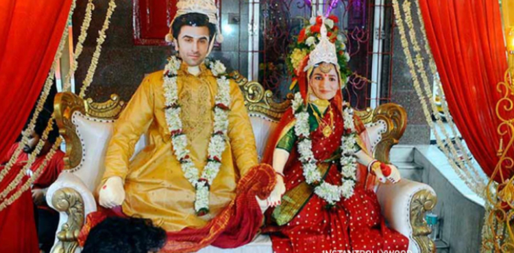 یہ تصاویر ریاست کلکتہ کی ہیں۔ مداحوں نے دیو ہیکل گڑیا اور گڈے کو بنگالی عروسی لباس میں سجا کر اُن کے چہروں پر رنبیر اور عالیہ کے چہرے لگا دہے۔
