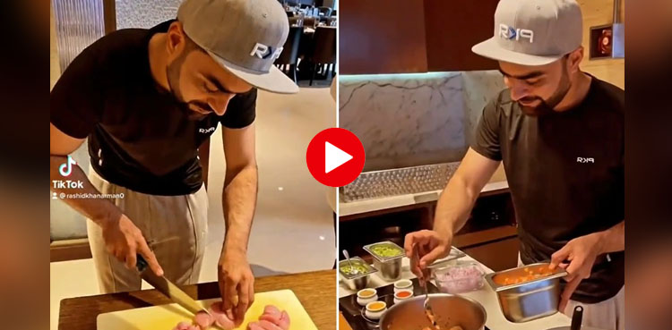 ویڈیو میں دیکھا جاسکتا ہے کہ راشد خان بڑی مہارت سے چکن کاٹ رہے اور سالن بھی بنارہے ہیں۔
