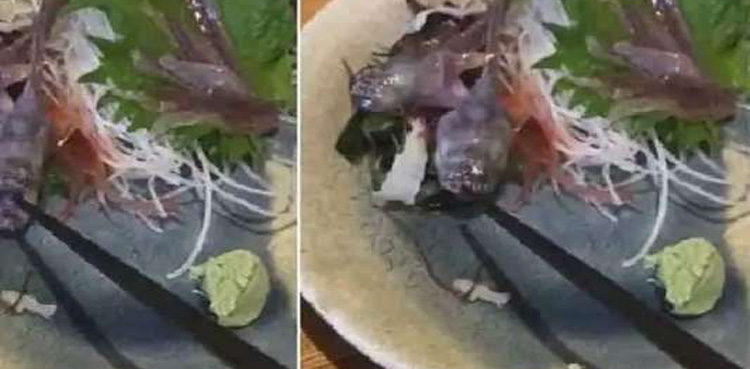 جاپانی ریسٹورنٹ میں گاہک کو سلاد کے ساتھ پیش کی جانے والی مچھلی اچانک زندہ ہوگئی، اس حیرت انگیز واقعے کی ویڈیو پر سوشل میڈیا وائرل ہورہی ہے۔