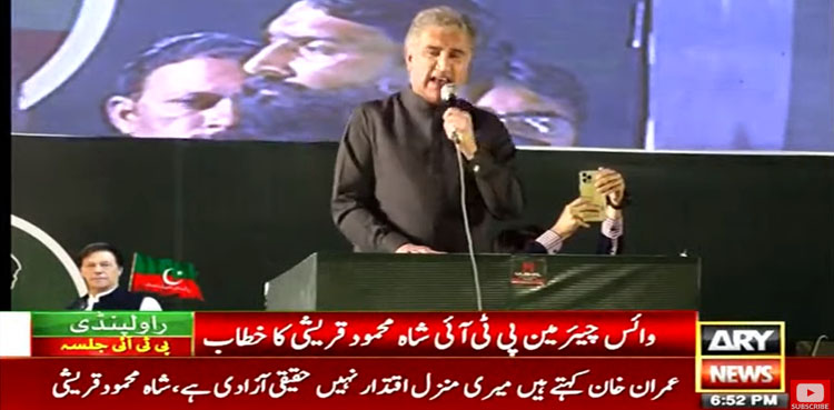 اے آر وائی نیوز کے مطابق سابق وزیر خارجہ شاہ محمود قریشی نے راولپنڈی میں حقیقی آزادی مارچ کے شرکا سے خطاب کرتے ہوئے کہا کہ عمران خان جان ہتھیلی پررکھ کر وزیر آباد بھی پہنچے آج راولپنڈی بھی پہنچے ہیں، عمران خان کہتے ہیں میری منزل اقتدار نہیں حقیقی آزادی ہے۔