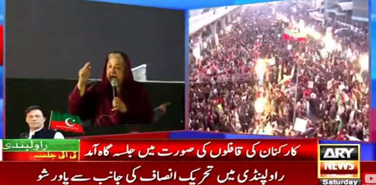 پی ٹی آئی کے حقیقی آزادی مارچ کے شرکا سے خطاب کرتے ہوئے سابق وزیر صحت یاسمین راشد نے کہا کہ تحریک انصاف کے جلسے میں خواتین کی بڑی تعداد شریک ہیں۔