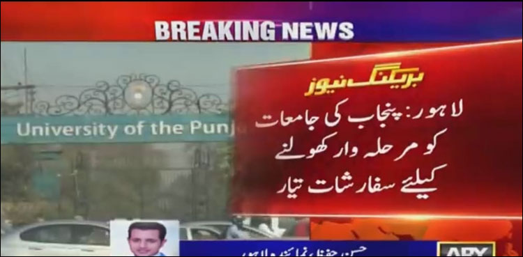 ذرائع کا کہنا ہے کہ جامعات کو ٹائم لائن کے حساب سے کھولا جائے گا، جس میں ماسٹرز، پی ایچ ڈی کی کلاس پہلے مرحلہ میں شامل ہوں گی۔