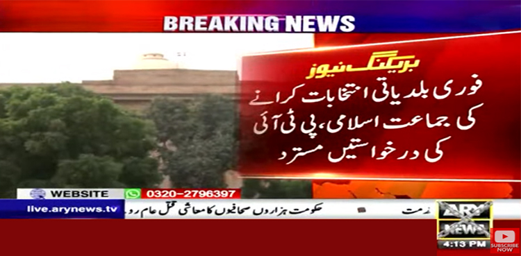 سندھ میں فوری بلدیاتی انتخابات کرانےکی جماعت اسلامی اور پی ٹی آئی کی درخواستیں مسترد کر دی گئیں۔