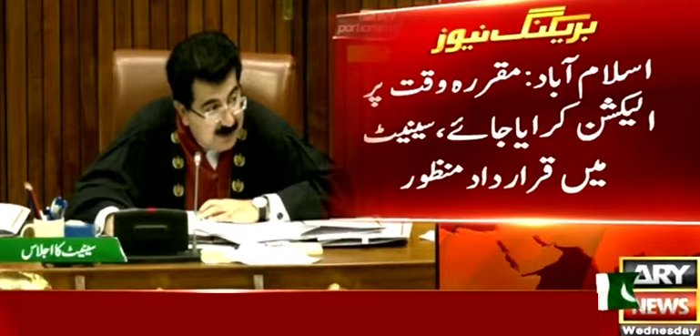 سینیٹ نے عام انتخابات مقررہ وقت پر کرانے کی قرارداد منظور کر لی ہے یہ قرارداد جماعت اسلامی کے سینیٹر مشتاق احمد خان نے پیش کی۔