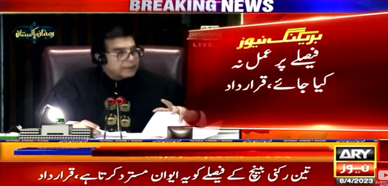 اے آر وائی نیوز کے مطابق پنجاب میں الیکشن سے متعلق سپریم کورٹ کے تین رکنی بینچ کے فیصلے کیخلاف قومی اسمبلی میں قرارداد منظور کر لی گئی ہے جس میں فیصلہ مسترد کردیا گیا ہے۔