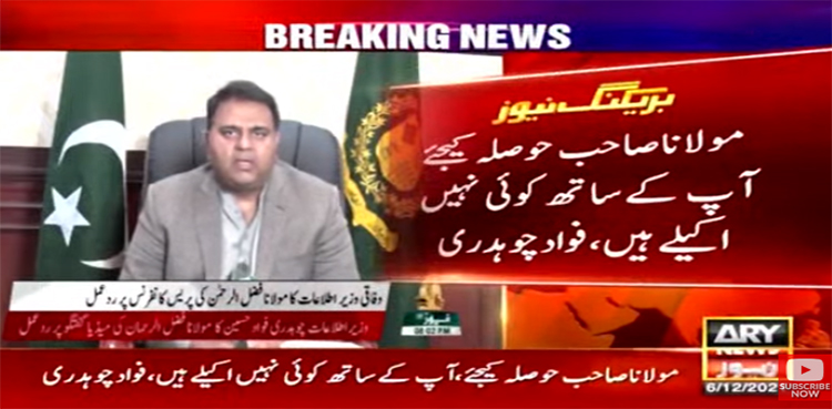 مولانافضل الرحمان کی پریس کانفرنس پر ردعمل دیتے ہوئے وزیراطلاعات فوادچوہدری نے کہا کہ تنقید اپوزیشن کا کام ہوتاہے لیکن مولانافضل الرحمان سسٹم کاحصہ نہیں ہیں ان کی بات سنےکےلیے اب کوئی بھی تیار نہیں ہے۔
