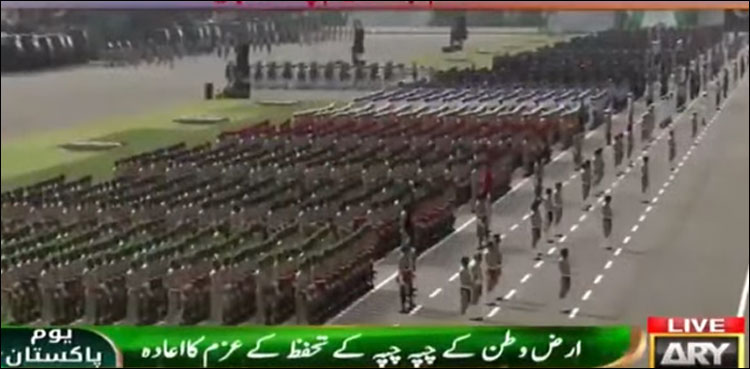 یوم پاکستان کی پریڈ میں تینوں مسلح افواج اور دیگر سیکیورٹی فورسز کے دستے مارچ پاسٹ میں حصہ لے رہے ہیں جبکہ جنگی جہاز فضائی کرتب کا مظاہرہ کیا۔