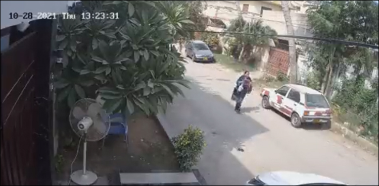 واقعے کی سی سی ٹی وی فوٹیج میں دیکھا جا سکتا ہے کہ گھر کے گیٹ پر لٹیرے نے اچانک خاتون پر حملہ کیا اور ان کے گلے سے سونے کی چین کھینچنے کی کوشش کی۔