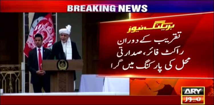 غیرملکی خبررساں ادارے کی رپورٹ کے مطابق کابل میں اشرف غنی کی تقریب حلف برداری کے دوران راکٹ حملہ کیا گیا، راکٹ صدارتی محل کی پارکنگ میں گرا، راکٹ حملے میں اشرف غنی سمیت دیگر شخصیات محفوظ رہیں۔